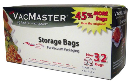 Large enough for common everyday use and a perfect size for individual meals, this 32-count package of 1-quart storage bags helps keep foods fresh up to five times longer than normal preservation methods. The 3-1/2-mil-thick material creates a superior bag for optimum freshness and a reliable seal. Easy to use, just fill the bag with items to be packaged, leaving about three inches at the top of the bag to allow enough room for sealing. Place the edge of the bag over the sealed bar of the vacuum-packaging machine, and make sure the open end of the bag rests in the spill trough. Vacuum and seal using the instructions of the vacuum-packaging machine. Typical embossed-channel vacuum bags tend to flatten over time, minimizing the channel for air to escape, which leads to an incomplete vacuum process. These bags, however, feature a unique design that includes a third layer of perforated material to create an effective channel for air to escape, maximizing bag suction during the vacuum process. The bags work harder so the machine doesn't have to. Even more, the bags can be frozen, refrigerated, microwaved, or boiled--making dinnertime a snap. Made in the USA, the bags are designed for use with all vacuum-packaging systems, including the SVP-5, MagicVac, Tilia, Rival, Kenmore, Foodsaver, and Black & Decker. Each industrial-strength pre-cut vacuum-storage bag measures 8 by 11-1/2 inches.