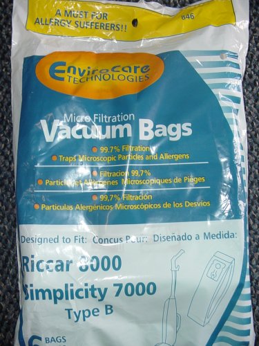 These are generic Riccar/Simplicity Micro-Filtration upright vacuum cleaner bags made by Envirocare. Micro-Filtration bags have an electro-statically charged inner liner which traps 99.7% of all airborne allergens including; dust mites, pet dander, pollen, ragweed, most bacteria, aerosols CFC particles, and many other microscopic particles that cause asthma and allergy sufferers problems. Micro-Filtration bags are 40% more efficient in capturing these particles then standard single walled vacuum bags. Each bags also has a convenient seal, allowing you to seal the dust in before replacing the bag, preventing a face full of dust as your pulling the bag out of the vacuum. These bags will fit Riccar upright models; 8600, 8650, 8850, 8900, 8920, 8925, 8905, 8955. Also Fits Simplicity Upright Models 7*** (denotes digits between 000-999).